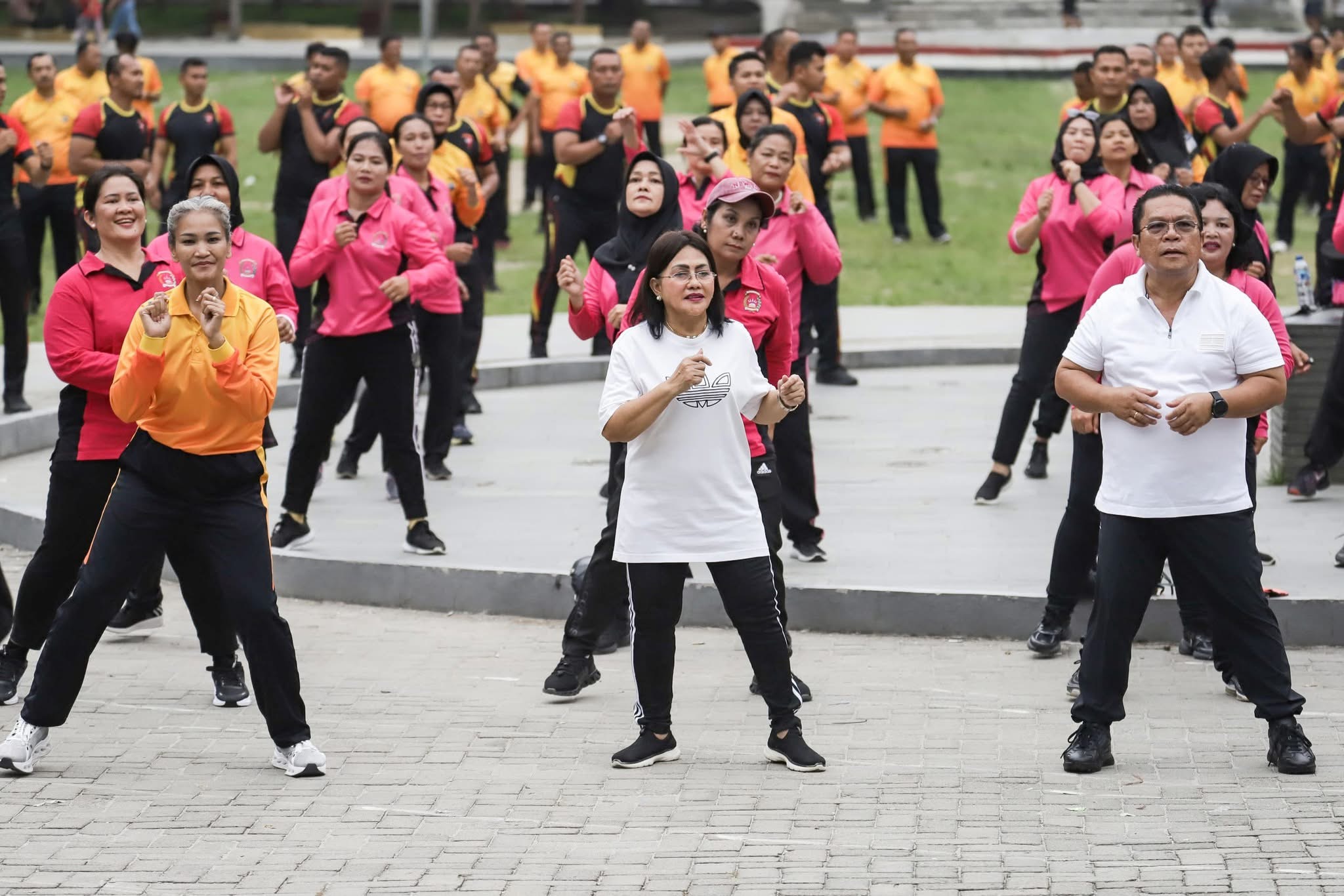 Di Lapangan Adam Malik, Olahraga Bersama dilanjutkan dengan senam sehat. Kembali, Wesly dan Ny Liswati berbaur mengikuti senam yang dipimpin instruktur profesional.