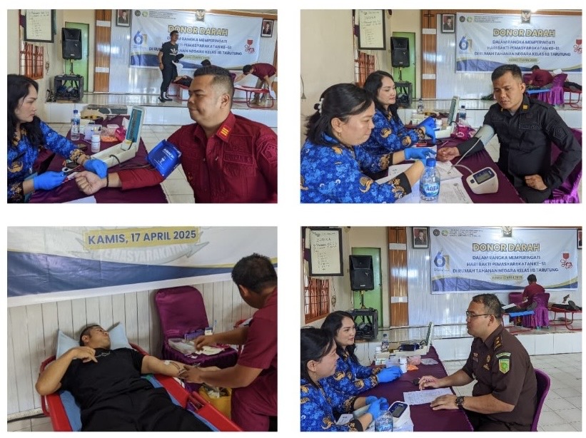 Dalam rangka memperingati Hari Bakti Pemasyarakatan (HBP) ke-61 Tahun 2025, Kepala Rumah Tahanan Negara (Ka. Rutan) Kelas IIB Tarutung, Evan Yudha Putra Sembiring bersama Kasubsi Pelayanan Tahanan, Jonias B. Pakpahan, Kasubsi Pengelolaan, Mian H.R. Simarmata, Kepala Kesatuan Pengamanan Rutan, James Bond Naibaho serta seluruh jajaran pegawai mengikuti donor darah yang digelar di aula serba guna Rutan Tarutung, Kamis (17/04). Kegiatan donor darah juga diikuti personil Polres Tapanuli Utara, personil Kodim 0201/TU dan Kejaksaan Negeri Tapanuli Utara.