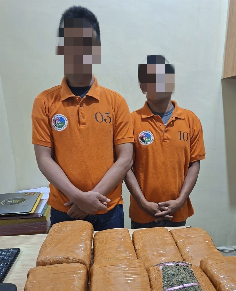 Dua tersangka yang diamankan masing-masing berinisial Andi (38) dan Nazri (45), bersama barang bukti berupa delapan bungkus ganja kering seberat total 13 Kg, satu buah tas, dan tiga unit handphone yang digunakan dalam transaksi.
