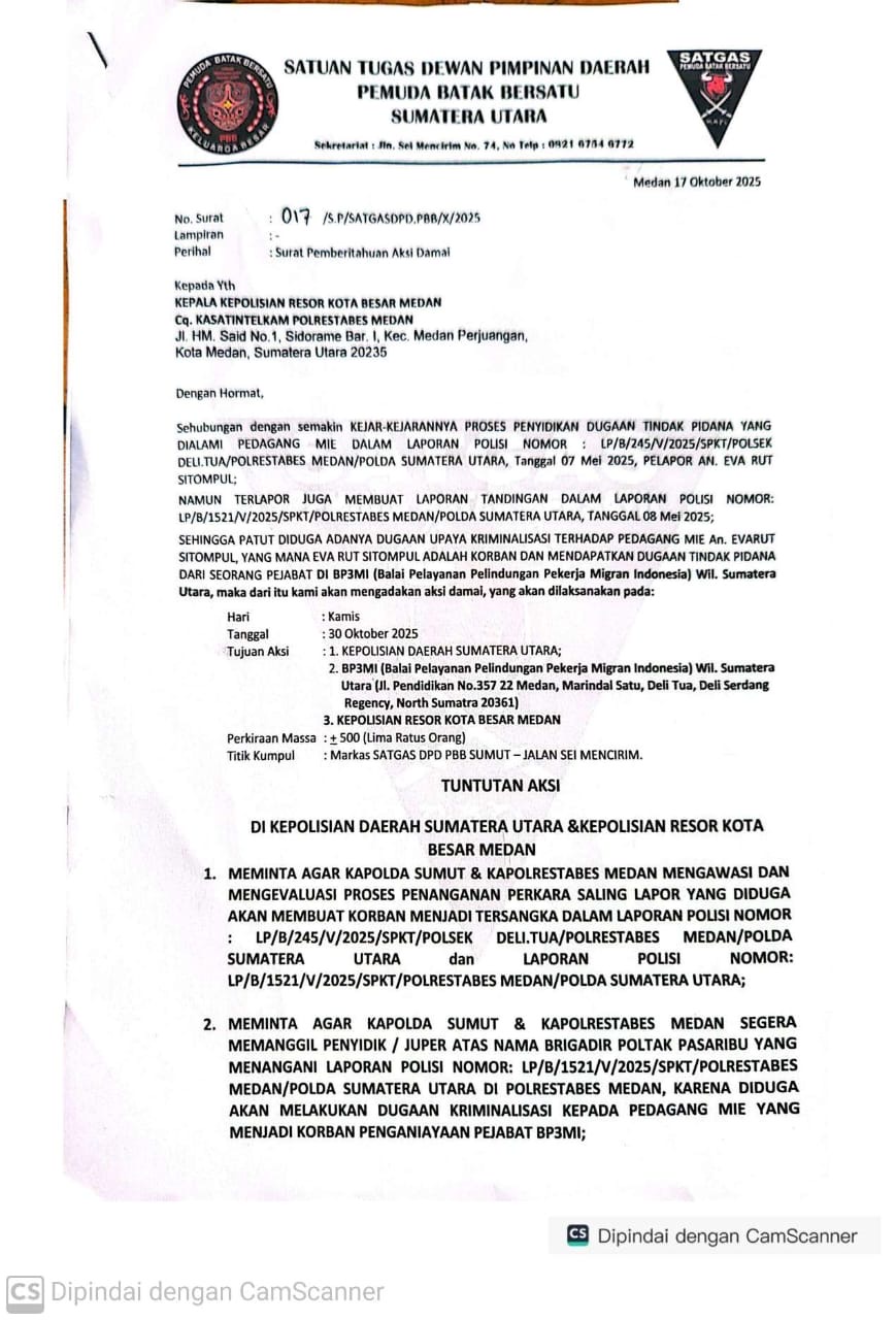 Satuan Tugas (Satgas) Dewan Pimpinan Daerah Pemuda Batak Bersatu (DPD PBB) Provinsi Sumatera Utara secara resmi melayangkan surat pemberitahuan aksi damai kepada Kepolisian Resor Kota Besar (Polrestabes) Medan pada Kamis, 17 Oktober 2025.
