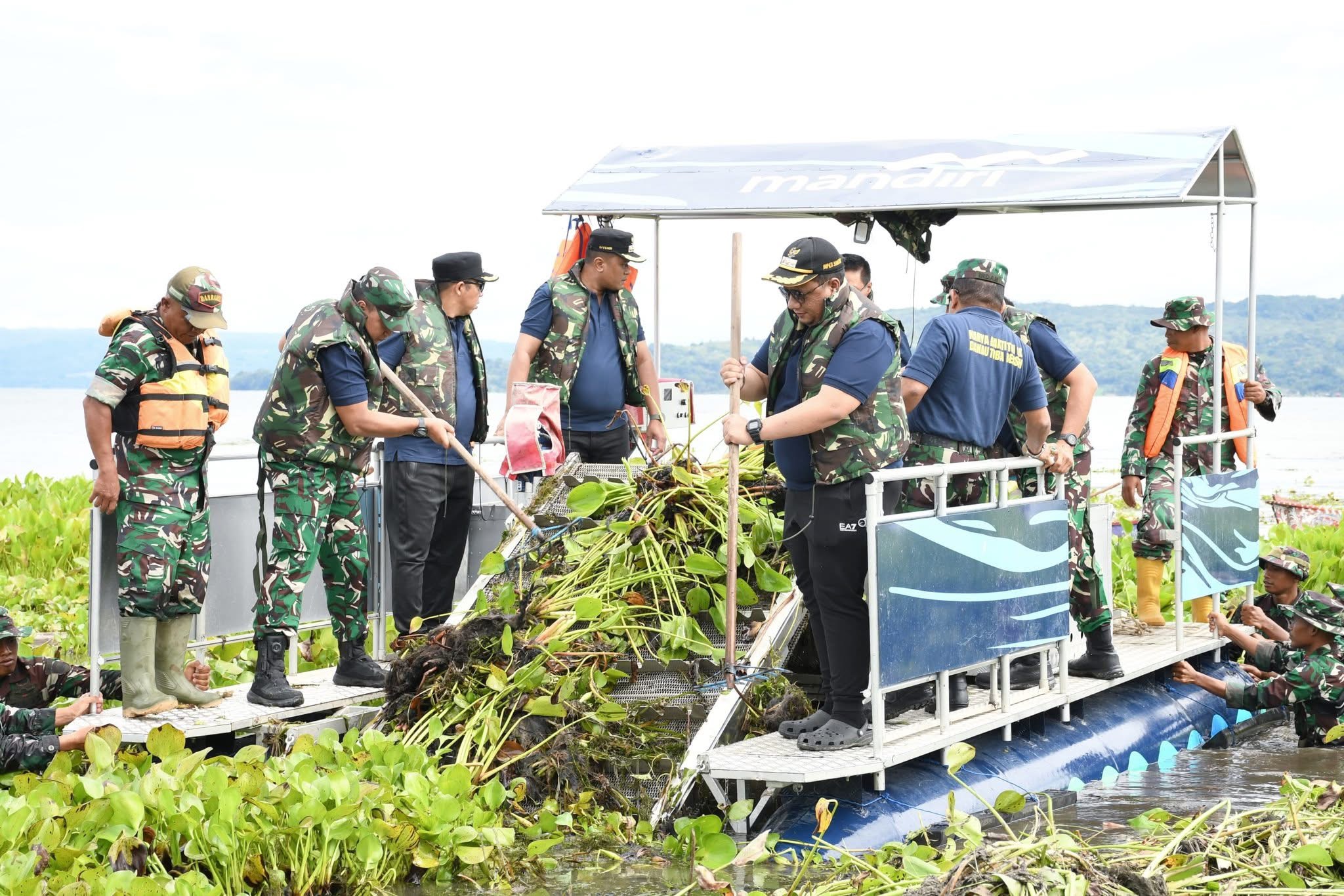 Pada kesempatan tersebut, Mayjen TNI Rio Firdianto bersama rombongan dan seluruh Bupati turut serta membersihkan langsung eceng gondok di perairan Pantai Landai, Desa Lumban Gaol.