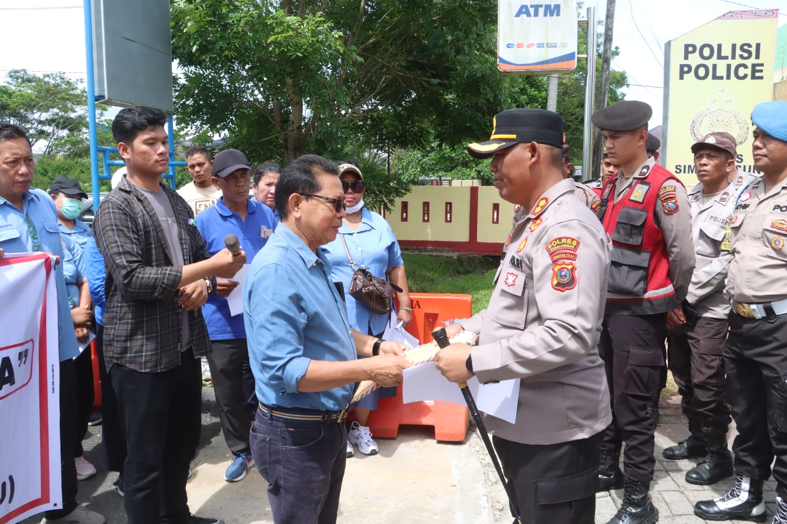 Kapolres Simalungun, AKBP Marganda Aritonang, S.H., S.I.K., M.M., menerima perwakilan massa aksi unjuk rasa dari Sumut Watch (Advokasi Kebijakan Publik) bersama pegawai PDAM Tirta Lihou yang menggelar aksi di tiga lokasi berbeda pada Rabu (14/5/2025).
