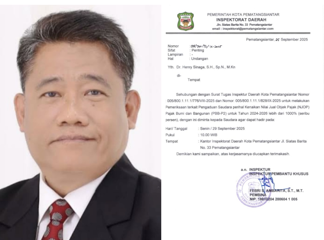 Menurut Dr Henry Sinaga, dia diundang untuk hadir pada hari Senin, 29 September 2025, Pukul 10.00. WIB, di Kantor Inspektorat Daerah Kota Pematangsiantar, Jl. Siatas Barita No. 33, dalam rangka pemeriksaan terkait pengaduannya perihal kenaikan NJOP 1.000 persen di Kota Pematangsiantar demikian siaran pers Dr Henry Sinaga.