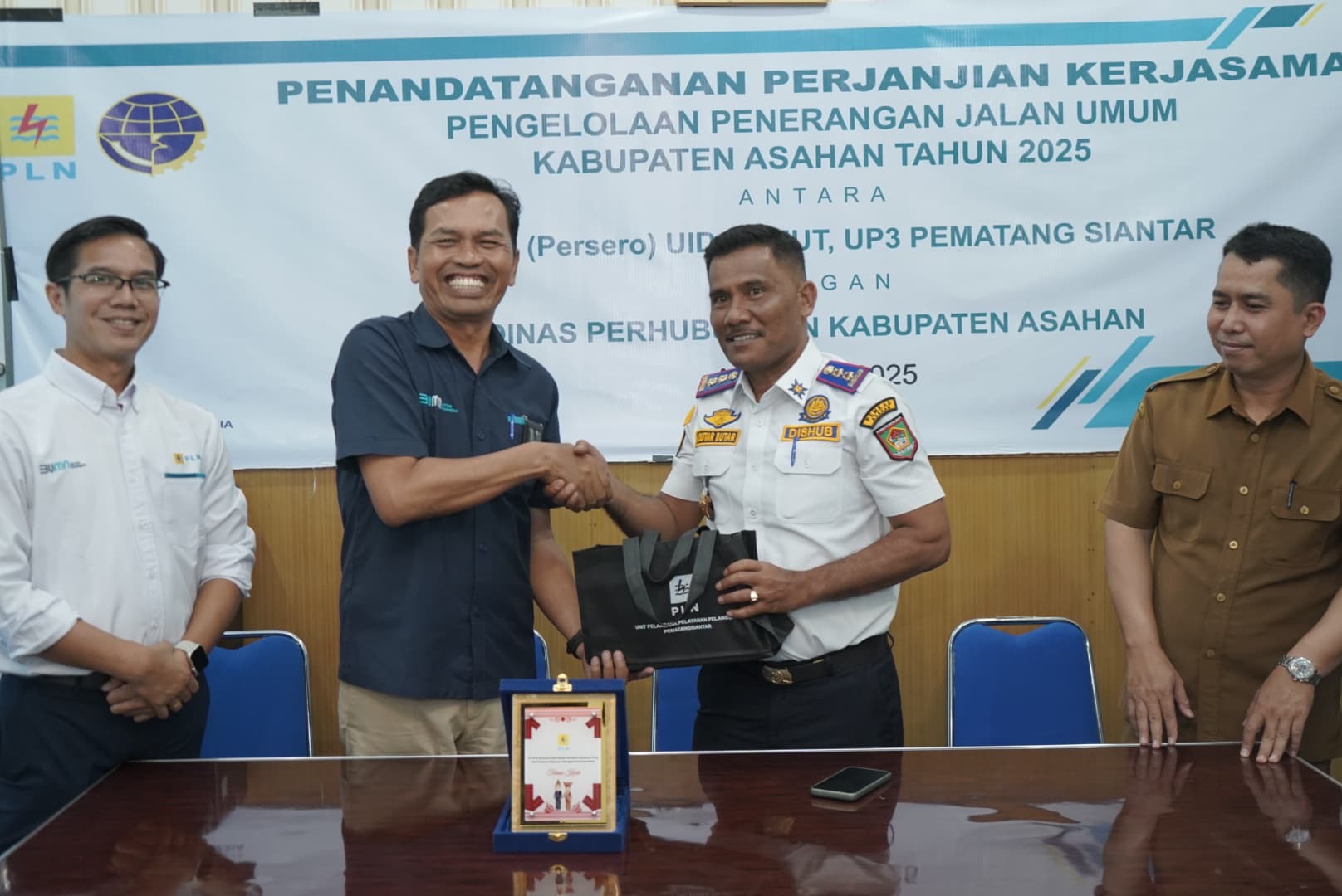 Kegiatan dirangkai dengan penyerahan plakat dari pihak PT. PLN (Persero) Unit Induk Distribusi Sumatera Utara UP3 Pematang Siantar kepada Kepala Dinas Perhubungan Kabupaten Asahan. Turut hadir dalam acara penandatanganan tersebut adalah Posma Sihombing (ASMAN TEL), Sekretaris Dishub M. Afifuddin, Manager ULP, Kisaran Fadli Umawi serta pejabat dilingkungan Dinas perhubungan Kabupaten Asahan beserta Staf. (Rls/Red)