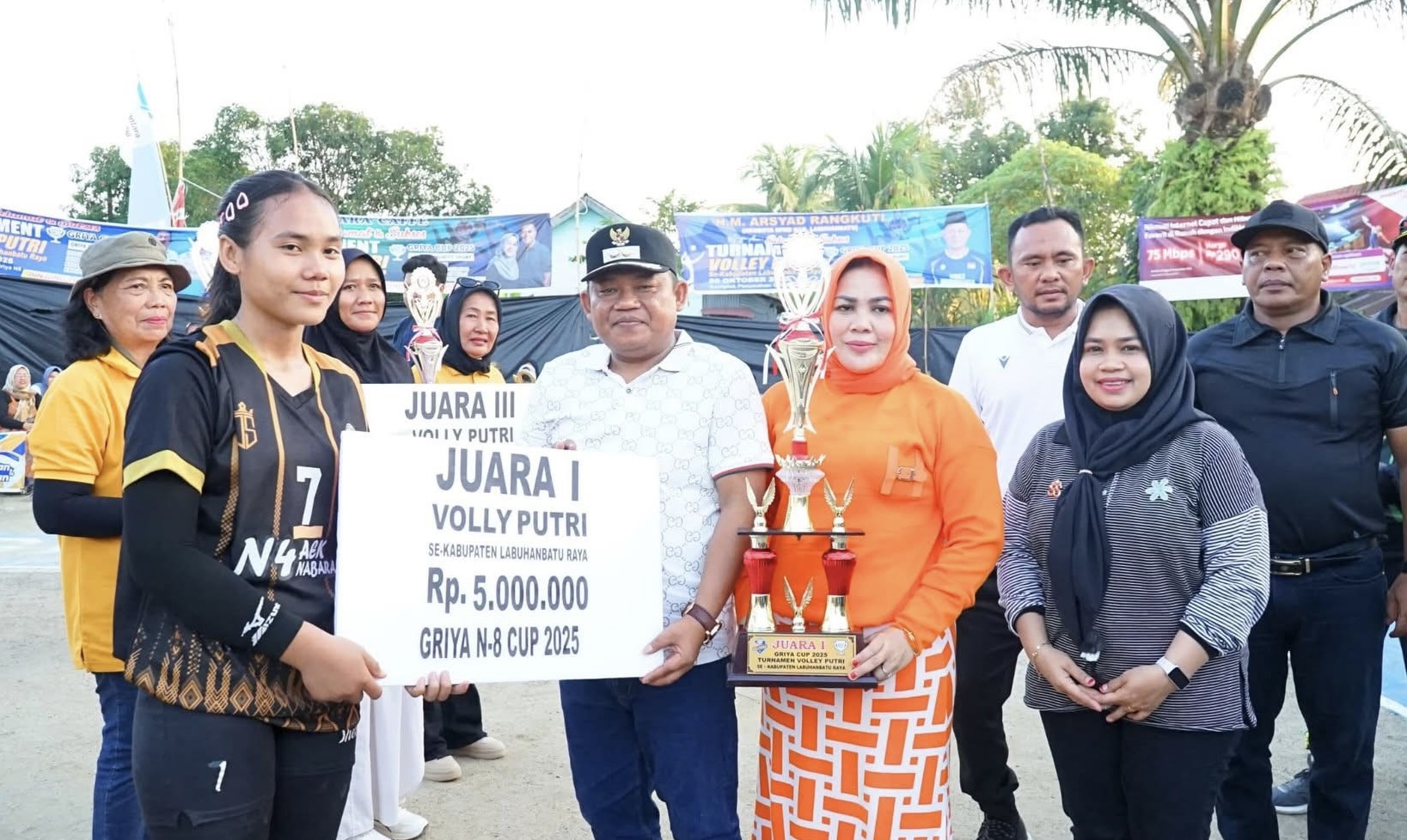Wakil Bupati Labuhanbatu H. Jamri ST, didampingi Ketua TP-PKK Labuhanbatu Ny. Hj. Wan Juma Sari Dewi Jamri, menghadiri penutupan turnamen Bola Volly Putri Griya Cup 2025, di Desa N 8, Kecamatan Bilah Hulu, Minggu (26/10/2025).