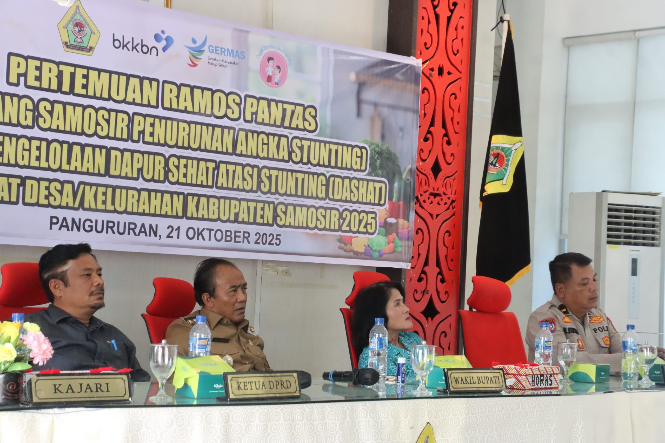 Wakil Bupati Samosir Ariston Tua Sidauruk menegaskan bahwa stunting masih menjadi persoalan mendesak yang harus diselesaikan bersama, mengingat dampaknya tidak hanya mempengaruhi tumbuh kembang anak, tetapi juga masa depan bangsa. “Stunting menjadi ancaman serius bagi generasi penerus. Karena itu kita harus menjadikan penanganan stunting sebagai prioritas utama,” ujar Ariston saat membuka Pertemuan Ramos Pantas Melalui Pengelolaan Dashat di Aula Kantor Bupati Samosir, Selasa (21/10/2025).