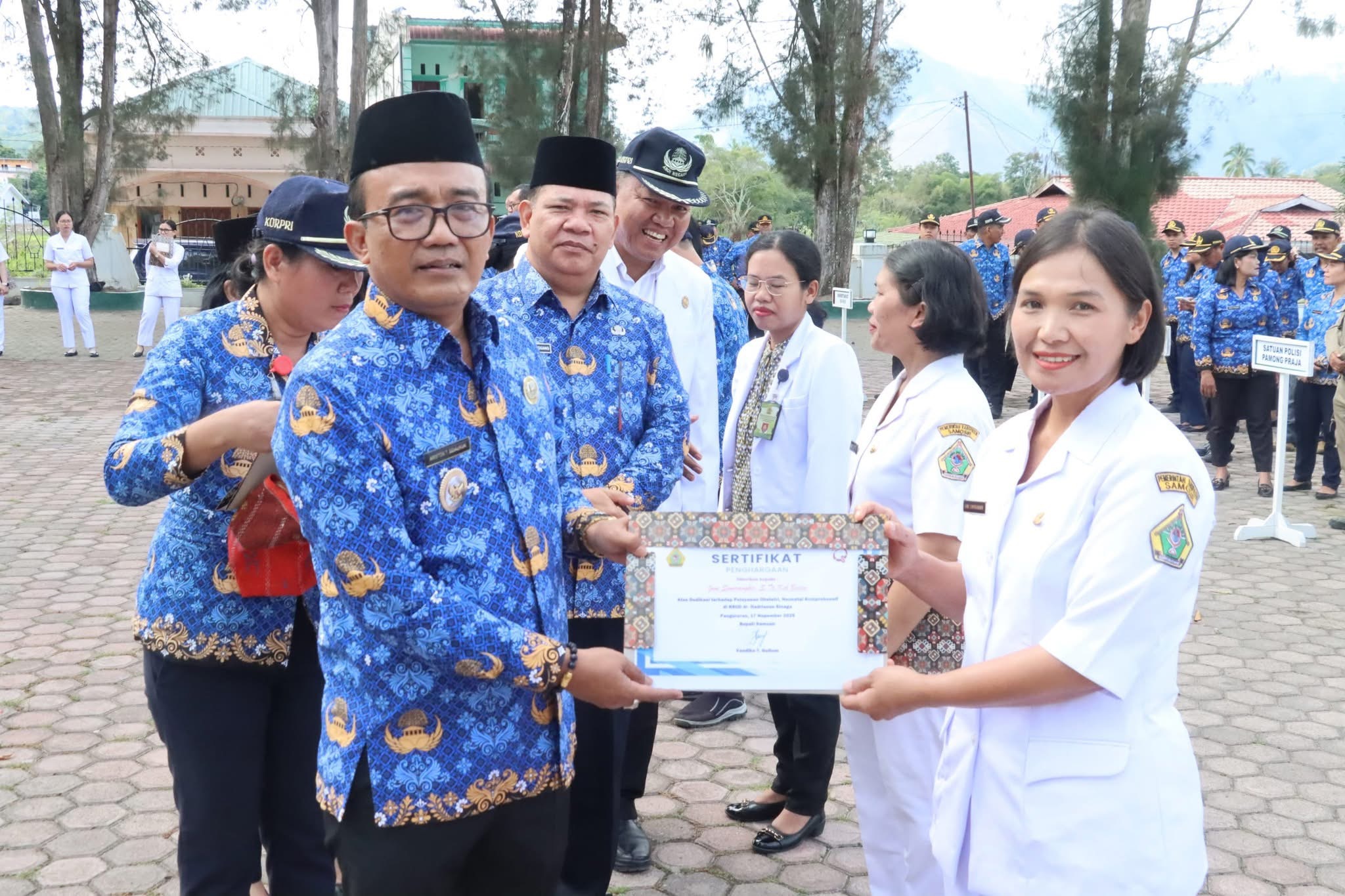 Pemerintah Kabupaten Samosir melaksanakan upacara peringatan Hari Kesehatan Nasional (HKN) ke-61 yang dirangkai dengan Hari Kesadaran Nasional di Halaman Kantor Bupati Samosir, Senin (17/11/2025).