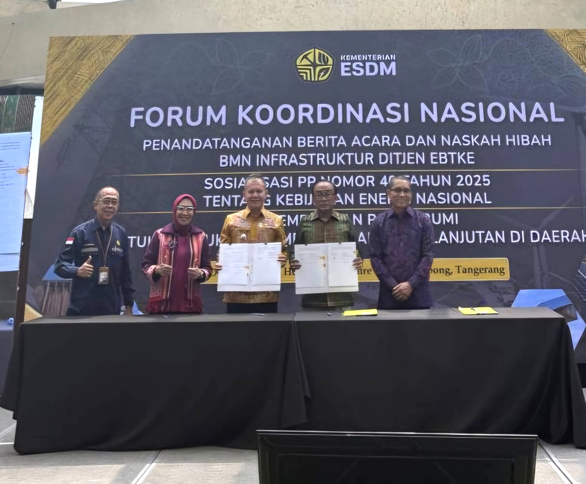 Wakil Bupati Samosir Ariston Tua Sidauruk didampingi oleh Kepala Dinas Perhubungan Samosir, Laspayer Sipayung melakukan Penandatanganan Berita Acara Serah Terima (BAST) dan Naskah Hibah Barang Milik Negara (BMN) Direktorat Jenderal Energi Baru, Terbarukan dan Konservasi Energi (EBTKE) Kementerian ESDM kepada pemerintah daerah, yang dilaksanakan di JHL Solitaire Gading Serpong, Tangerang Banten, Rabu (3/12/2025).