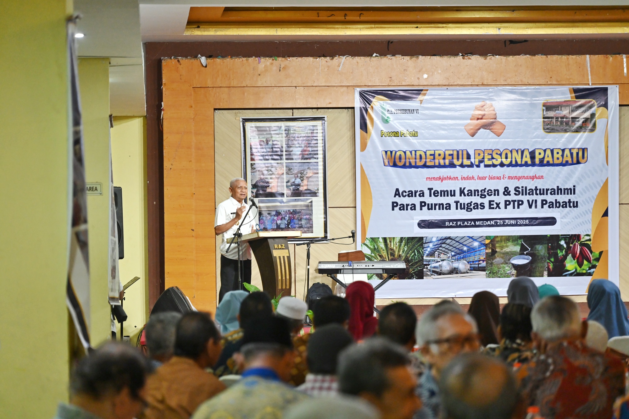 Wakil Gubernur (Wagub) Sumatera Utara (Sumut) Surya menceritakan kisah singkat masa kecil dan mudanya sebagai ‘Anak Kebon’ di hadapan para pensiunan perkebunan saat menghadiri Temu Kangen dan Silaturahmi Para Purna Tugas Eks PTPN VI (sekarang PTPN IV) Pabatu di Raz Hotel, Jalan Dr Mansyur Medan, Rabu (25/6/2025).