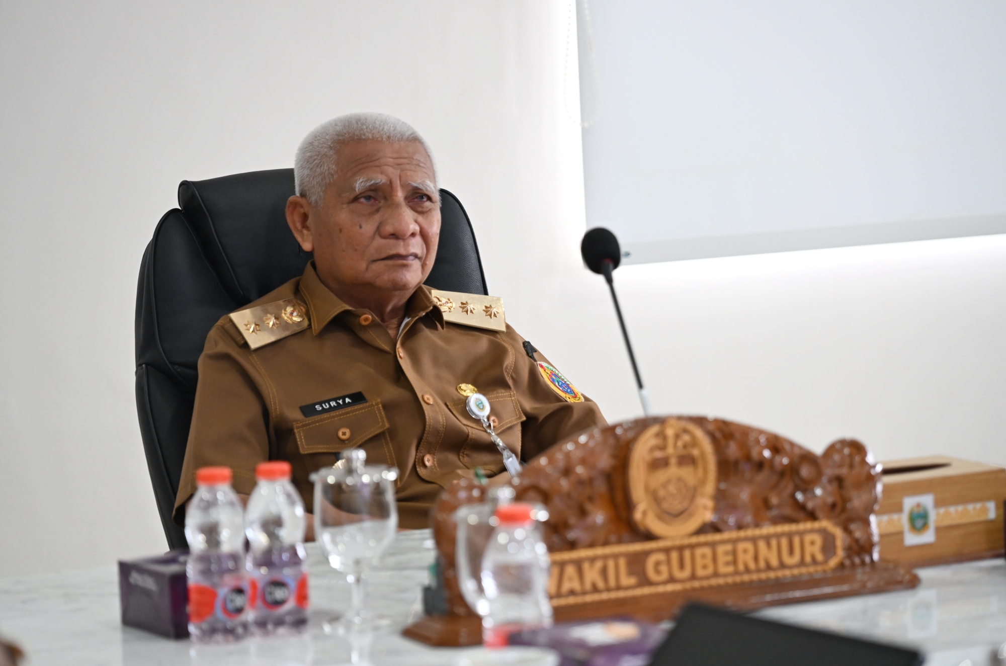 Wakil Gubernur (Wagub) Sumatera Utara (Sumut) Surya mengikuti Rapat Koordinasi (Rakor) Pengendalian Inflasi Daerah yang dipimpin oleh Menteri Keuangan (Menkeu) RI Purbaya Yudhi Sadewa secara virtual dari Kantor Gubernur Sumut, Jalan Pangeran Diponegoro Nomor 30 Medan, Senin (20/10/2025).