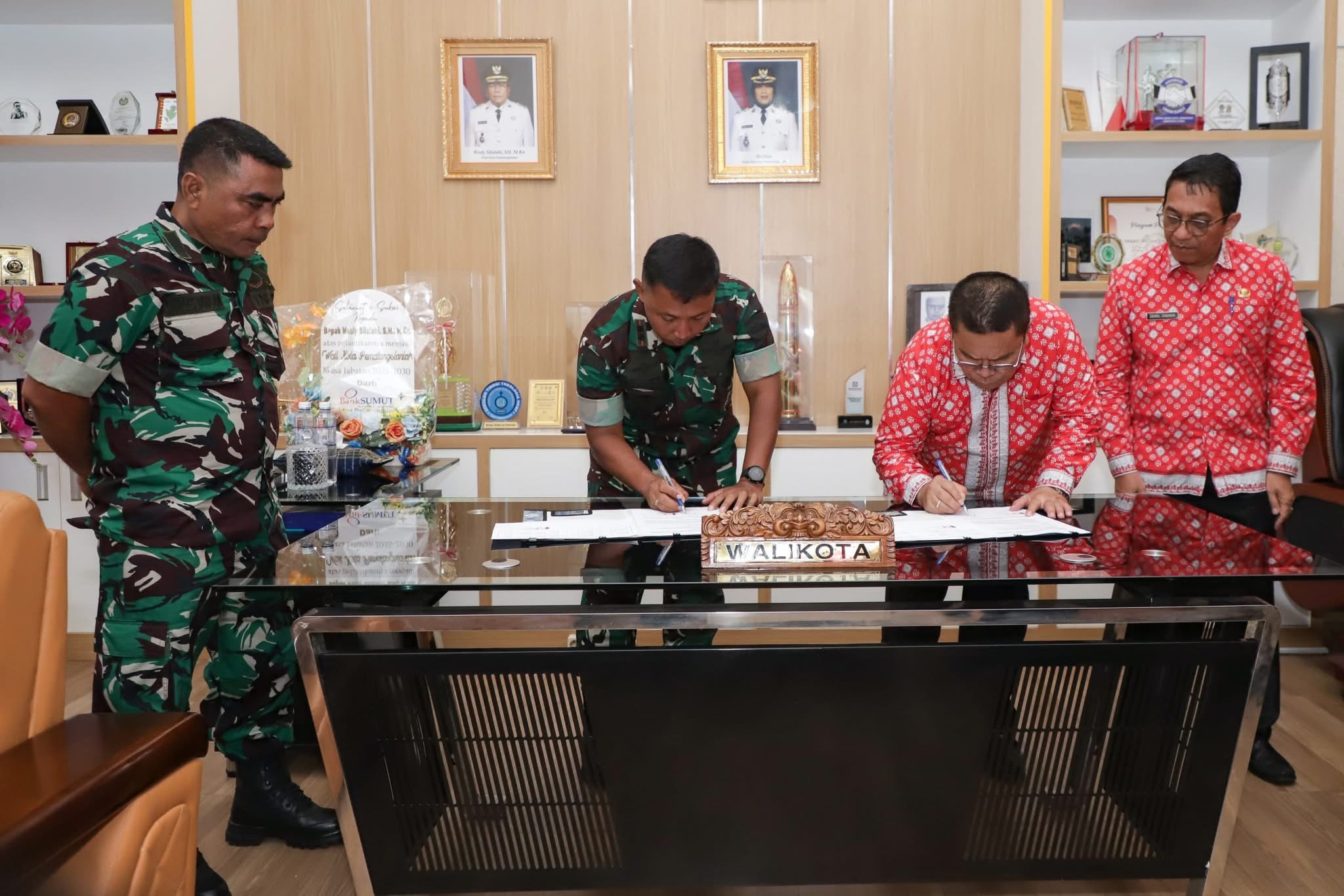 Wali Kota Pematangsiantar Wesly Silalahi SH MKn dan Dandim 0207/Simalungun Letkol Inf Slamet Faojan MHan menandatangani Nota Kesepakatan Pemerintah Kota (Pemko) Pematangsiantar dengan Komando Distrik Militer (Kodim) 0207/Simalungun tentang Pelaksanaan Kerja Sama Operasionalisasi Kegiatan Karya Bhakti TNI di Wilayah Kota Pematangsiantar (Swakelola Tipe II) Tahun Anggaran (TA) 2025. Penandatanganan berlangsung di Kantor Wali Kota Pematangsiantar, Kamis (05/06/2025) siang.