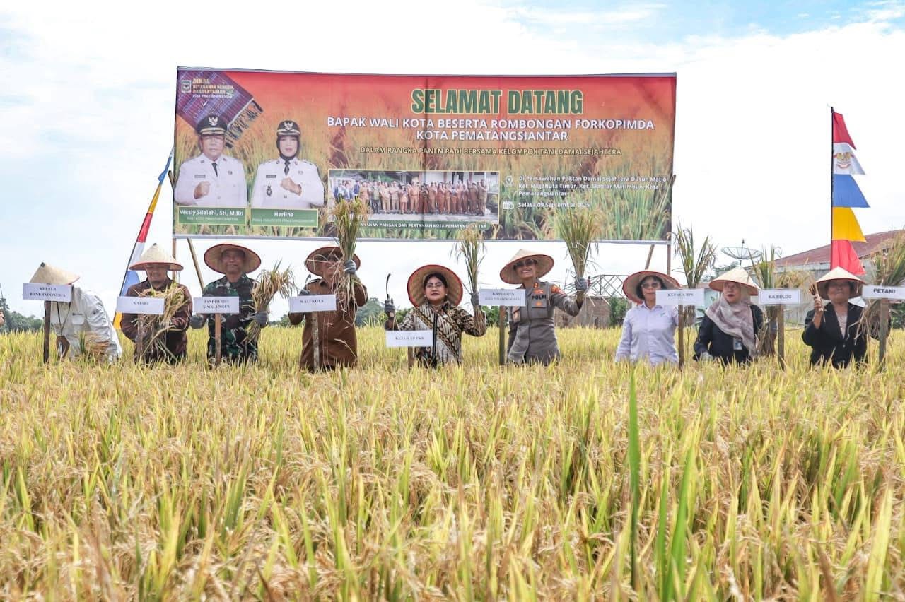 Wali Kota Pematangsiantar Wesly Silalahi SH MKn diwakili Asisten Perekonomian dan Kesejahteraan Rakyat Zainal Siahaan SE MM panen padi di persawahan Kelompok Tani (Poktan) Damai Sejahtera, di Dusun Matio Kelurahan Nagahuta Timur Kecamatan Siantar Marimbun, Selasa (09/09/2025) pagi. Turut hadir, Ketua TP PKK Kota Pematangsiantar Ny Liswati Wesly Silalahi dan Forkopimda.