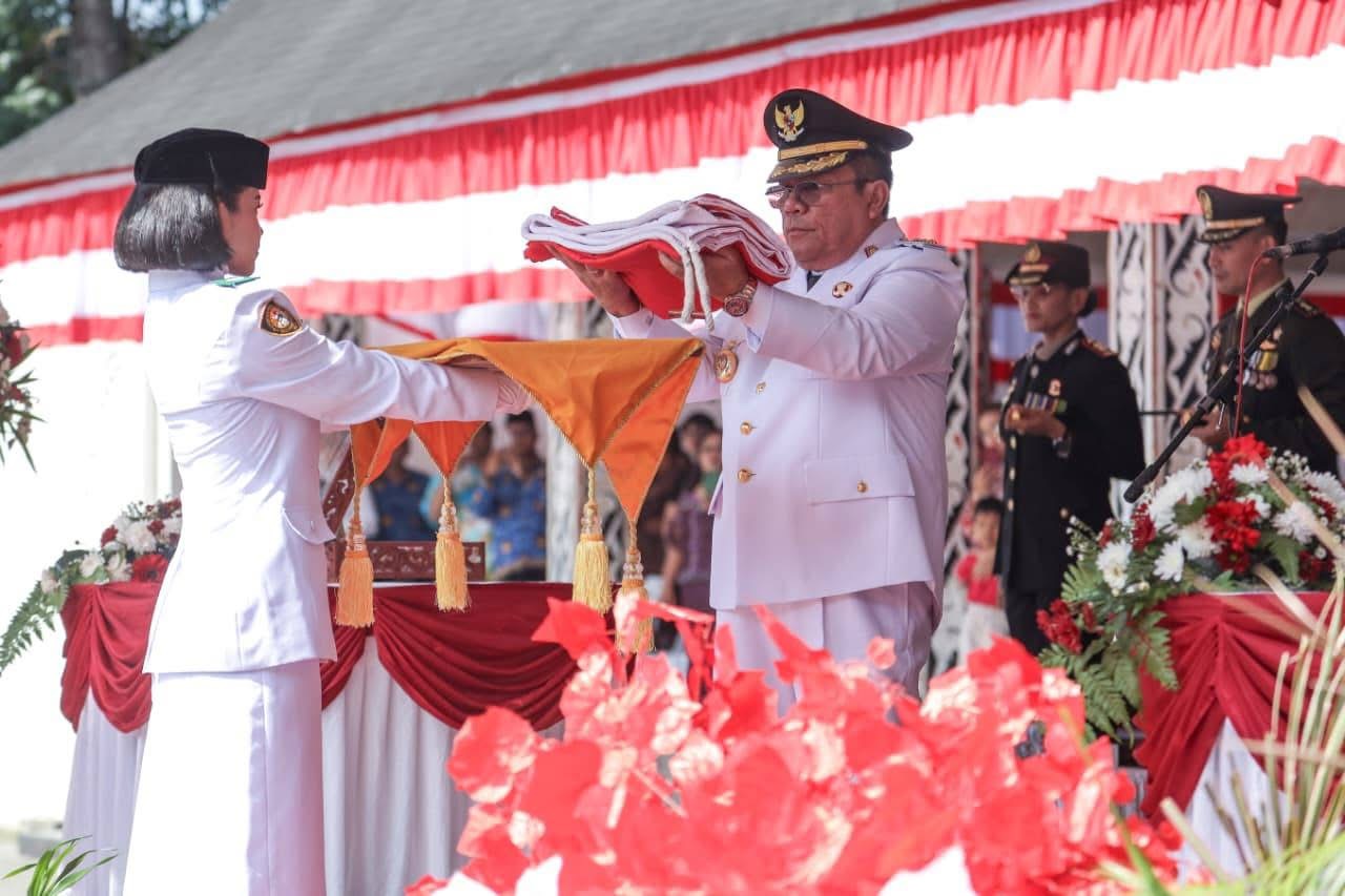 Bendera merah putih berkibar di upacara peringatan Detik-detik Proklamasi Kemerdekaan Republik Indonesia (RI) ke-80 Tahun 2025, di Lapangan Adam Malik, Minggu (17/08/2025). Bertindak sebagai inspektur upacara Wali Kota Pematangsiantar Wesly Silalahi SH MKn.