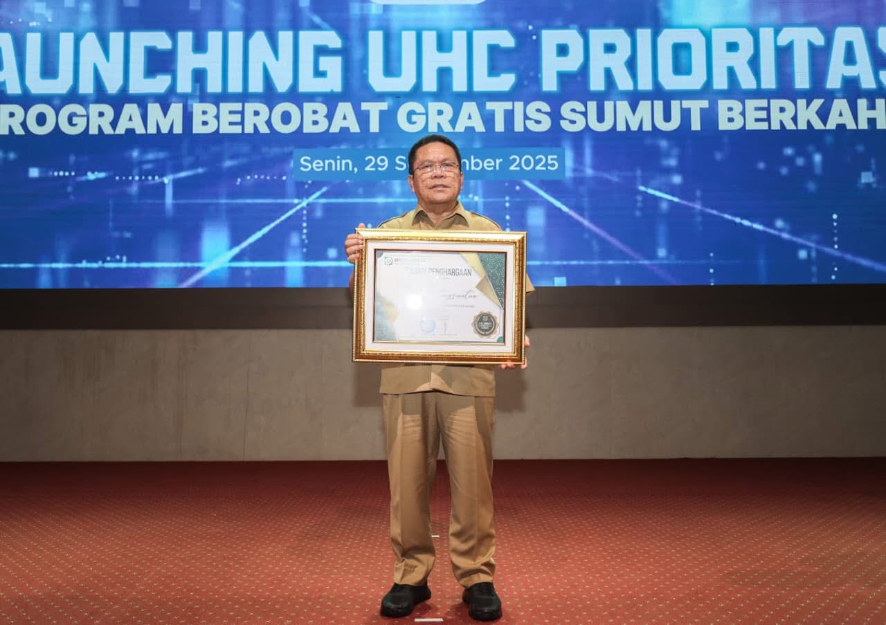Penyerahan penghargaan dan sertifikat tersebut dilakukan di acara Launching UHC Prioritas Program Berobat Gratis Sumut Berkah Provinsi Sumut, di Grha Bhineka Perkasa Jaya Lubukpakam Kabupaten Deliserdang, Senin (29/09/2025) sore.
